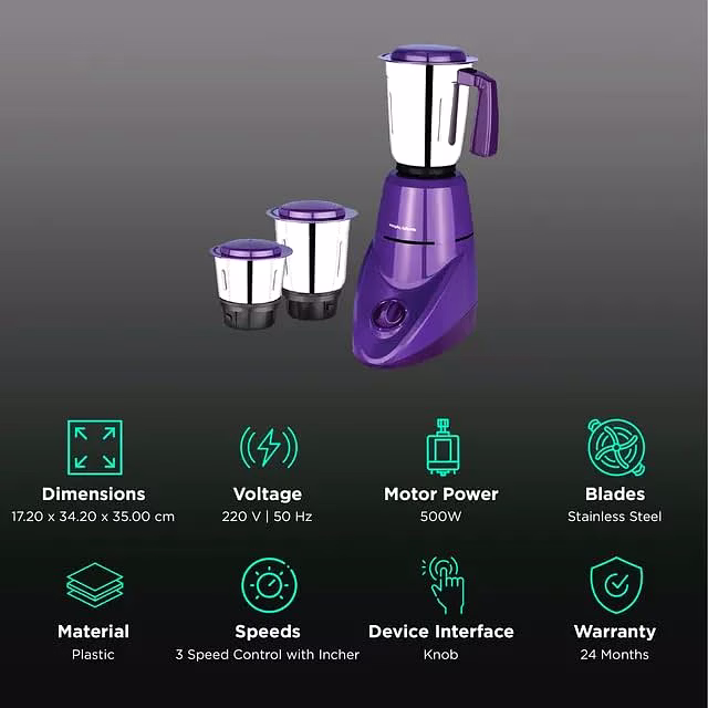 morphy richards Aero Pro 500 Watt 3 Jars Mixer Grinder (Overload Protection, Purple)